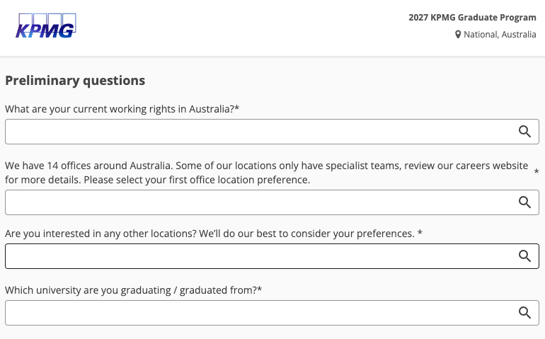 This section has a dropdown with all the locations where KPMG has an office. You can select whichever city you would like to work in, and you can also select interstate locations.