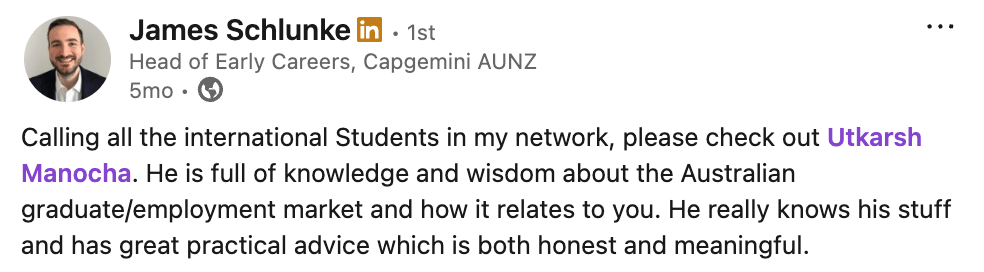 1. I’d love to connect and learn about any suitable opportunities or insights into the Australian job market.